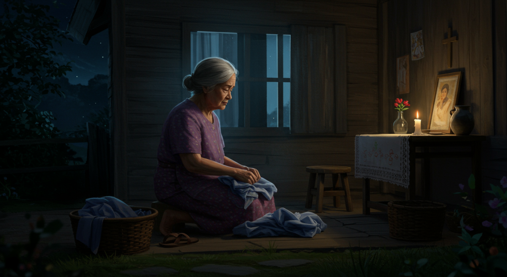 Ang bawat pagod sa kanyang katawan ay napapalitan ng kapayapaan sa kanyang puso. Ang kanyang buhay ay hindi isang pasanin, kundi isang walang katapusang awit ng pag-ibig. Ang kanyang mga kamay, na naglinis, nagluto, at nag-alaga sa buong maghapon, ay tahimik na nakakandong, puno ng alaala ng pagmamahal na kanyang ibinigay. Ang kanyang mga mata, na nakakita ng hirap at tuwa, ay ngayon nakatingin sa kinabukasan ng kanyang pamilya—isang kinabukasan na kanyang buong pusong binuo, araw-araw, nang walang pag-aalinlangan.