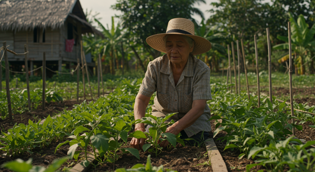 Bukod sa mga gawaing-bahay, mayroon din siyang maliit na hardin sa likod ng kanilang bahay. Dito siya nagtatanim ng gulay tulad ng talong, sitaw, at sili. Sa initan man o sa maulan, walang tigil si LolaMaria sa pag-aalaga sa kanyang mga tanim. Ang bawat patak ng pawis na umaagos sa kanyang noo ay isang patunay ng kanyang sipag at determinasyon. Ang mga ani mula sa kanyang hardin ay hindi lang nagbibigay ng sariwang gulay sa kanilang hapag, kundi nakakatulong din sa kanilang gastusin. Para sa kanya, ang bawat halaman na lumalago ay sumasalamin sa kanyang pamilya—kailangan ng patuloy na pag-aalaga upang lumago at mamunga. Ang kanyang araw ay puno ng pagsisikap, hindi para sa sarili, kundi para sa kapakanan ng lahat ng kanyang mahal sa buhay.