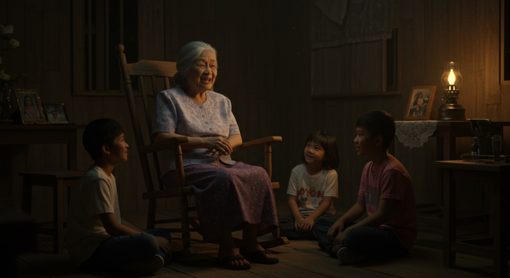 Sa paglubog ng araw, at sa pagdating ng malamig na simoy ng hangin sa probinsya, nagiging sentro ng pagtitipon ang bahay ni Lola Maria.Ito ang oras na umuuwi na ang kanyang mga anak at apo mula sa kanilang mga gawain. Ang dating tahimik na bahay ay napupuno ng ingay, tawanan, at kwentuhan. Pagkatapos ng hapunan, na sama-samang inihanda at kinain, sisimulan na ang paboritong bahagi ng gabi: ang kwentuhan sa sala.