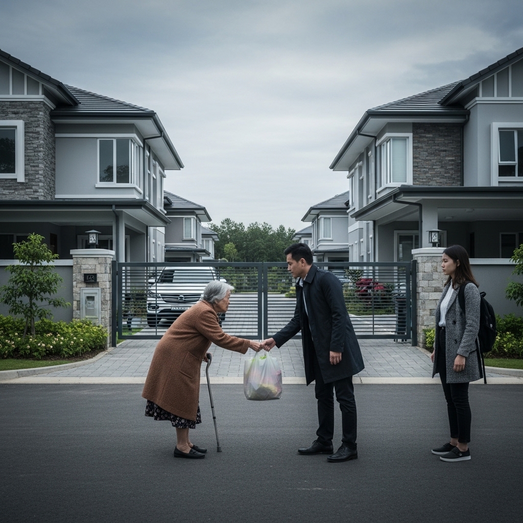 Kumuha siya ng isang supot ng instant noodles mula sa trunk ng kotse, inilagay ito sa kamay ng kanyang ina at marahang itinulak ito palabas ng gate.