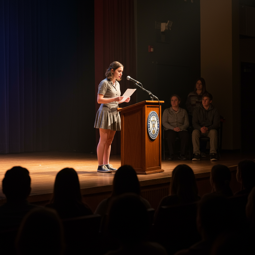 Ang gabing iyon ay puno ng pag-asa at kaba. Nasa bulwagan ng kolehiyo ang kanyang ina at mga kapatid,na walang kamalay-malay sa lalim ng kanyang gagawing pagbabahagi. Nang tawagin ang kanyang pangalan, huminga nang malalim si Emy. Tumaas siya sa entablado, ang mga mataay nakapako sa malayo, sa tila isang nag-iisang ilaw ng poste sa kanyang isipan. Ang kanyang tindig ay payat ngunit matatag, ang kanyang boses, sa una, ay nanginginig.