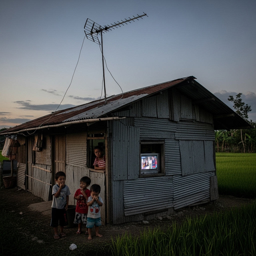 Apat na paslit ang madalas masilayan sa bukana ng kanilang bintana, tahimik na nakasiksik, ang mga mata’y nakatutok sa isang direksyon. Hindi kalayuan, sa kabila ng makitid na daan at ilang puno ng saging, naroon ang bahay ng kanilang kapitbahay, si Aling Selya. At sa bawat paglubog ng araw, pagkatapos ng kani-kanilang mga gawain, isang kakaibang liwanag at ingay ang bumubuhay sa dilim ng gabi—ang telebisyon niAling Selya.