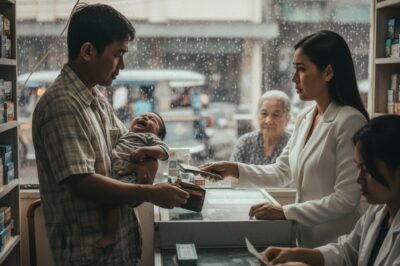 Nakakita siya ng maliit na pakete na may ilang piraso lang. Pagdating sa counter, muling umiyak ang sanggol. Nainis ang mga nakapila sa likod. Sa tabi, may isang babaeng nakasuot ng puting bestida, naka–wristwatch na mamahalin—malinis, elegante—at tahimik na pinagmamasdan ang eksena.