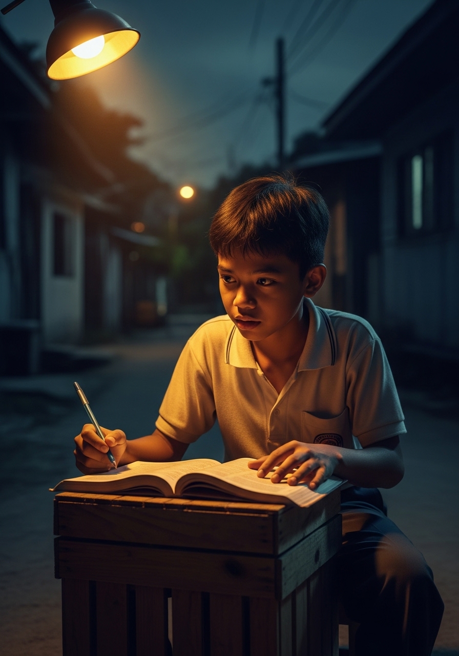 Sa isang tahimik na sulok ng baryo, may isang ilaw na laging nakasindi tuwing gabi—hindi mula sa bahay, kundi mula sa poste ng ilaw sa kanto. Doon, gabi-gabing nakaupo si Miguel, 14 taong gulang, may bitbit na lumang notebook at lapis na halos wala nang dulo. Habang ang ibang kabataan ay nakahiga na sa komportableng kama, siya ay patuloy pang kumakapit sa pangarap na minsan niyang pinangarap kasama ang kanyang ina.