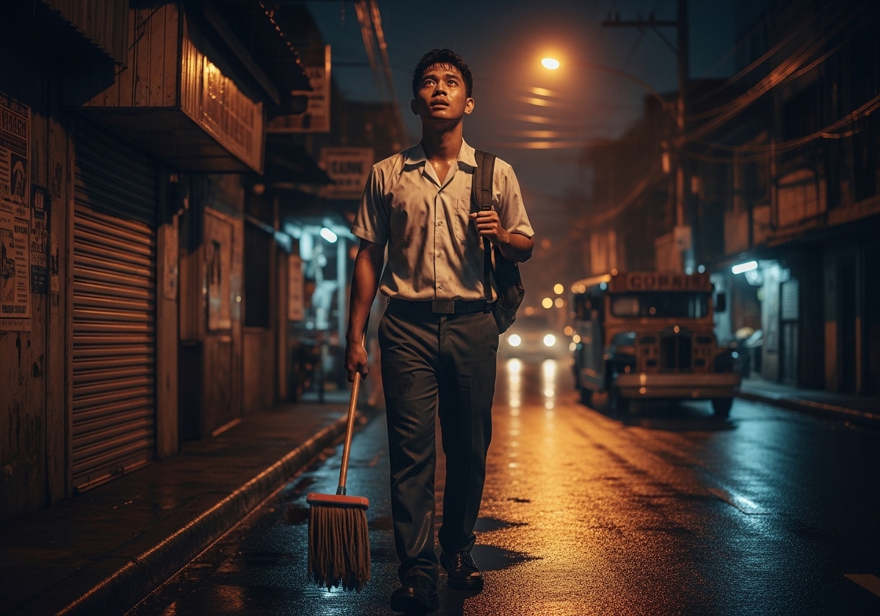 Mula sa isang maliit na barong-barong sa Tondo, araw-araw niyang inuulit ang parehong pagod na ritwal: mag-aaral sa umaga, maglilinis ng opisina sa gabi. Hindi ito ang pangarap niya, pero ito ang paraan para maabot niya iyon.