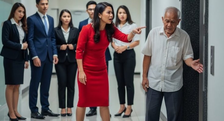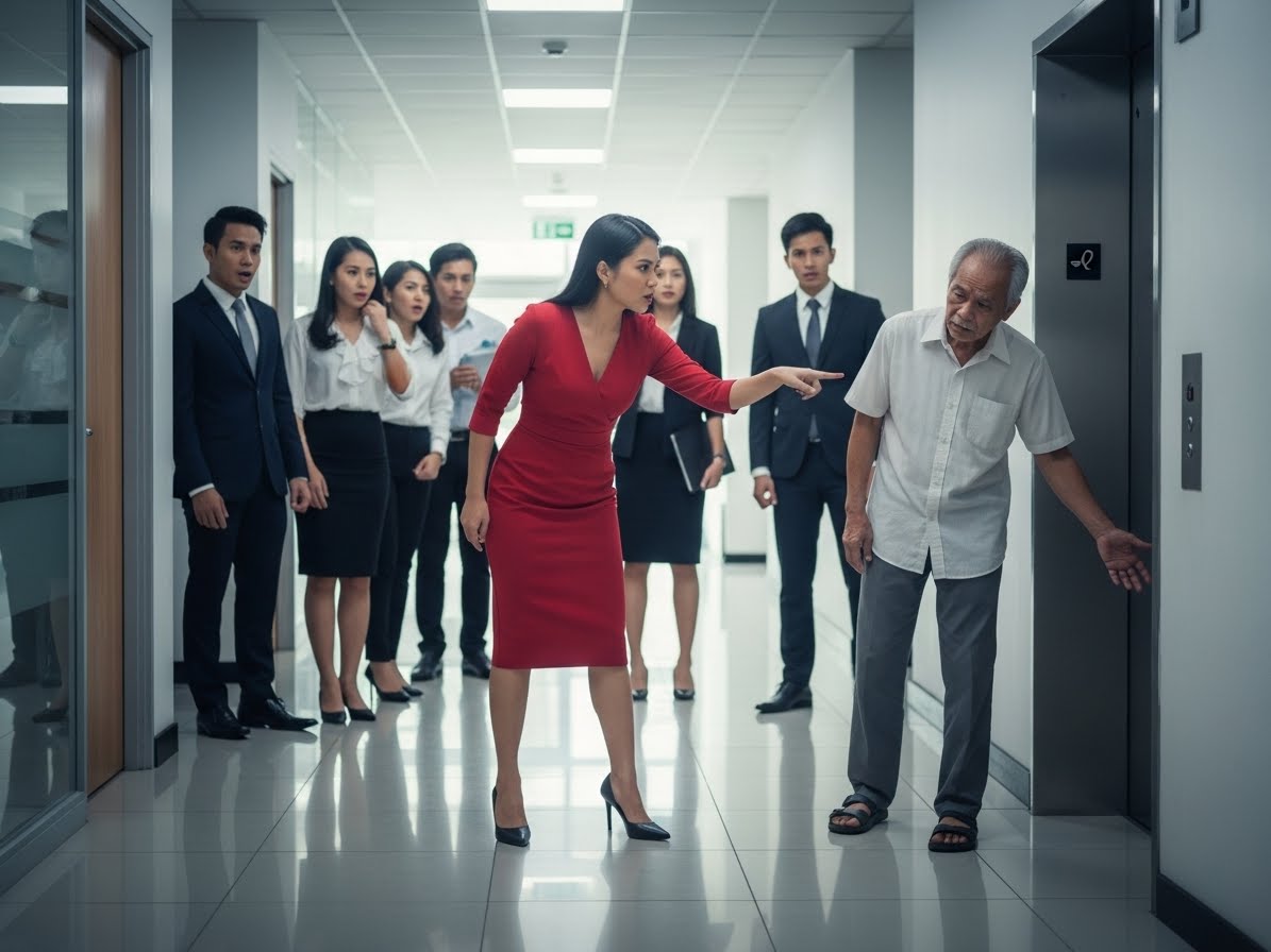Isang matandang lalaki, nakasuot ng simpleng polo at lumang pantalon, nakasandal sa pader malapit sa elevator. Pawisan, halatang pagod, parang nawawala.