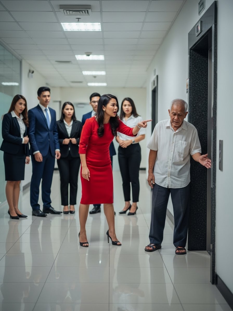 Isang matandang lalaki, nakasuot ng simpleng polo at lumang pantalon, nakasandal sa pader malapit sa elevator. Pawisan, halatang pagod, parang nawawala.